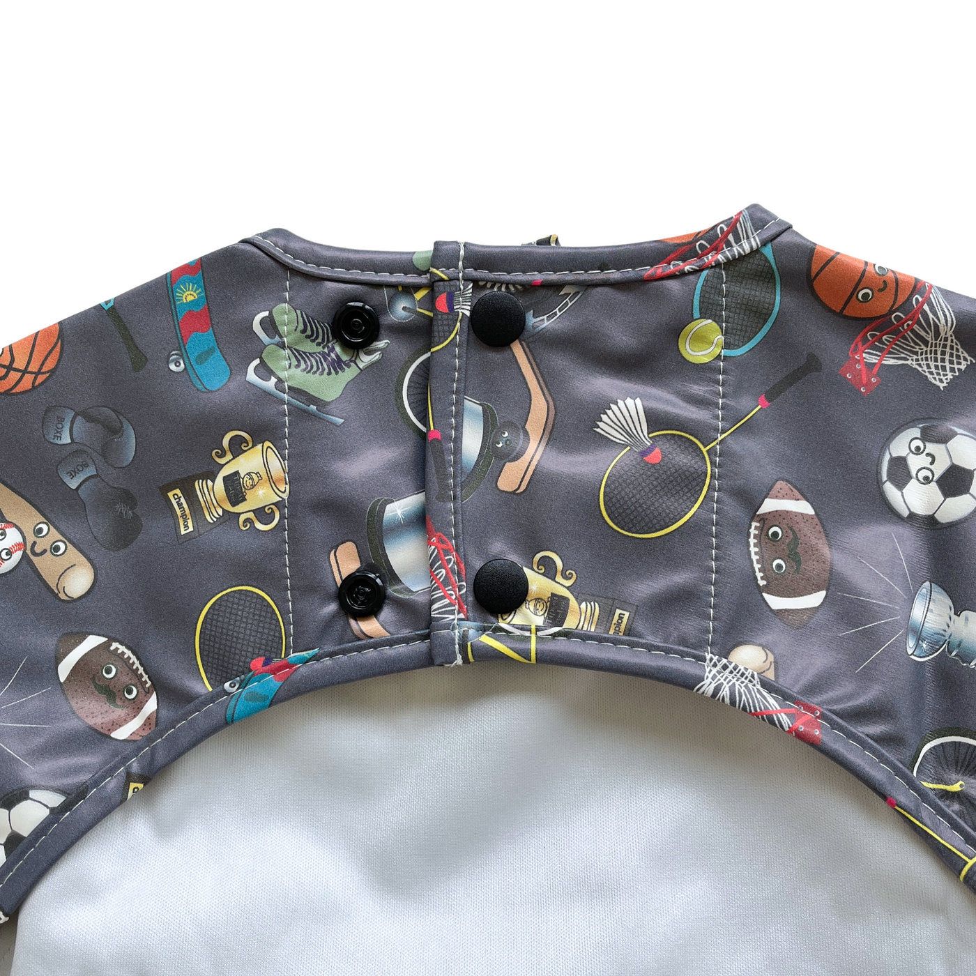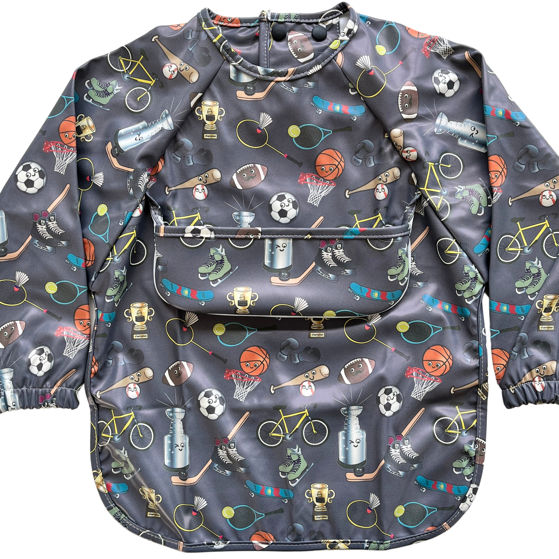 Long-sleeved waterproof bib apron for 6 - 36 months with foldable pocket and 2 push buttons on the back. This bib is easy to wash and is also perfect for mothers who decide to do baby-led weaning.