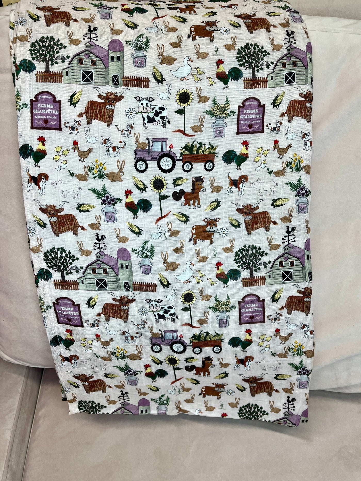 Couverture de mousseline en bamboo et coton dessinée et designée au Québec, Canada par l’illustratrice Danielle Pomerleau.