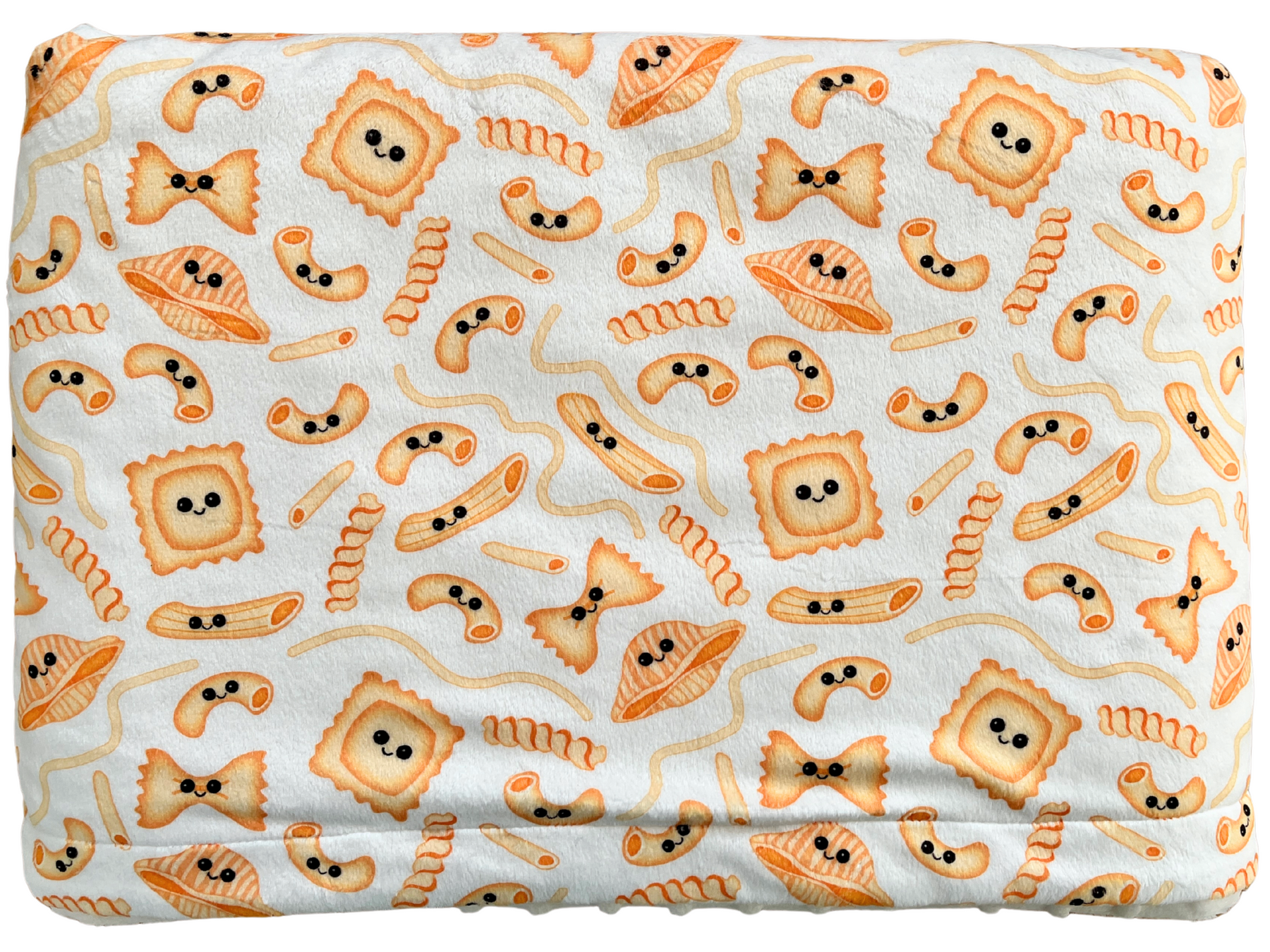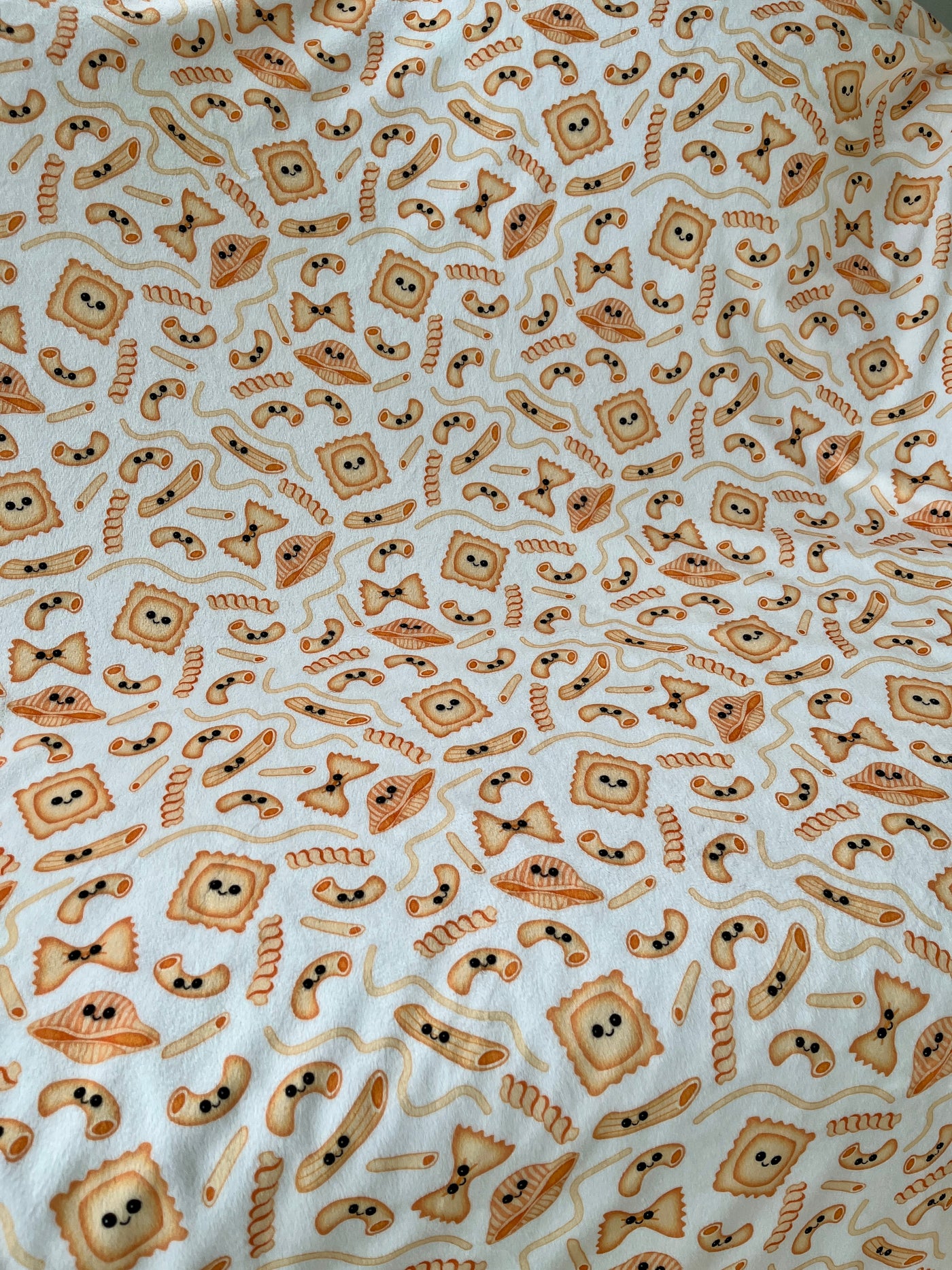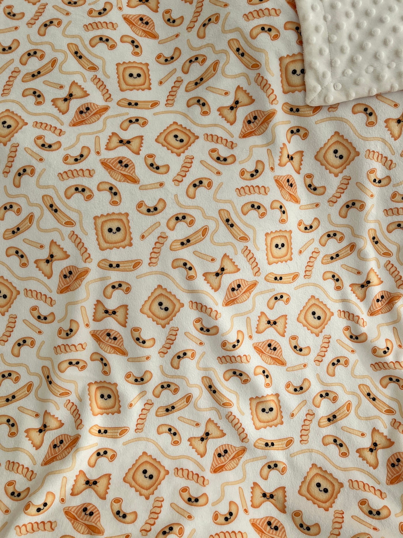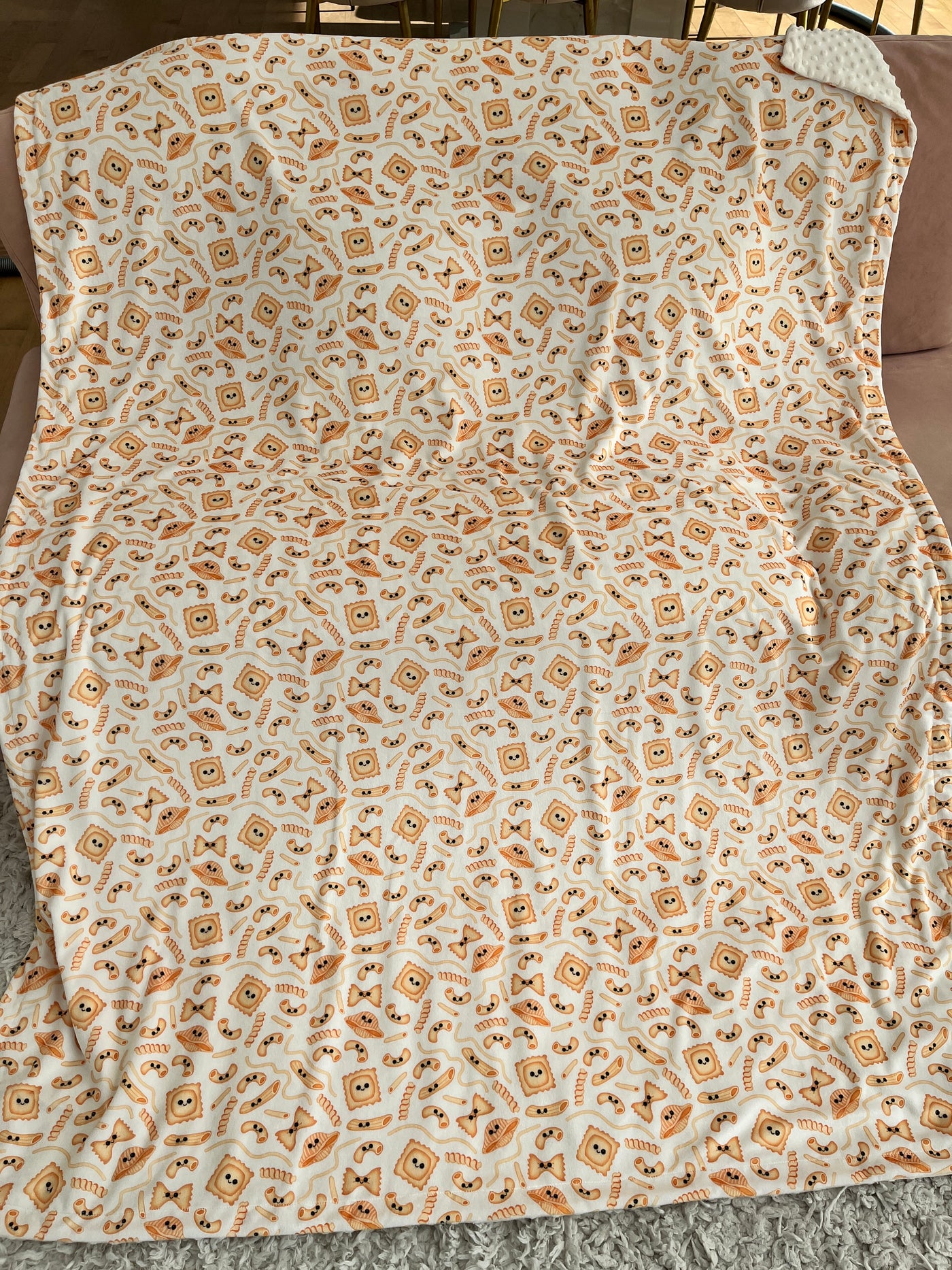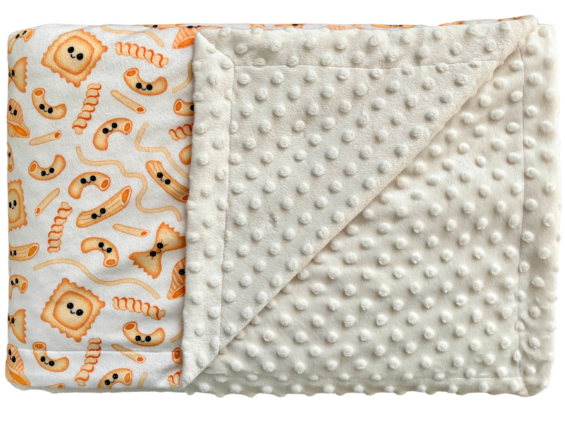 Doubles cotés en minky, un coté étant de couleur unie et l’autre avec une illustration. Lavable à l’eau froide et pas de séchage à la machine.